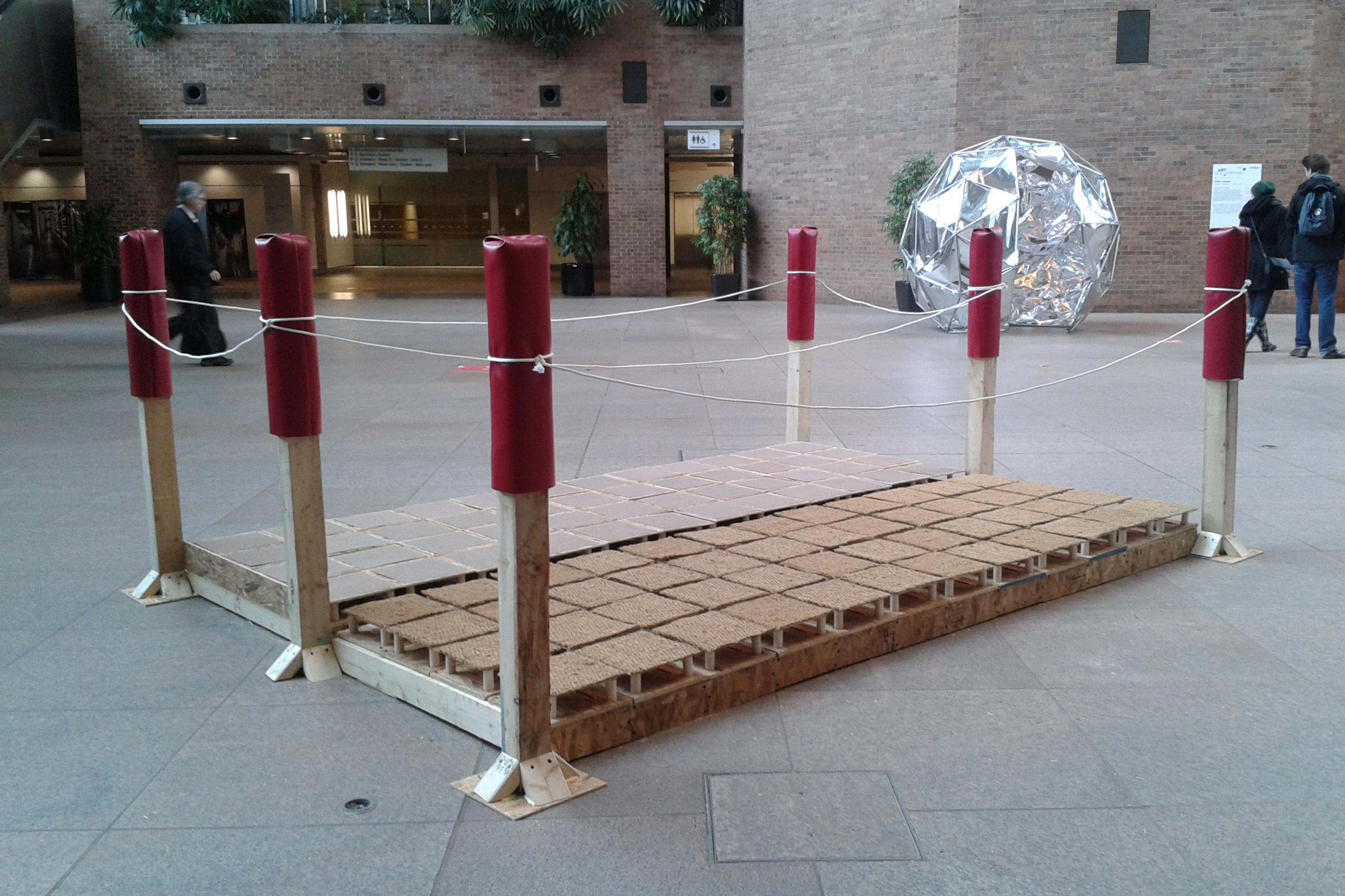 « L’amnésie des sols » is a formal and litteral representation of a passageway. It prompt viewers to examine their footprints. Since our environment is ever-changing, we should never thread the same ground twice. However, much like in a labyrinth, we use the same road, nearly every day, without realizing the traces that we left behind. With that said, these traces that we have left behind. With that said, these traces are only present at the exact moment that our feet hit the ground; they quickly disappear as we move away.