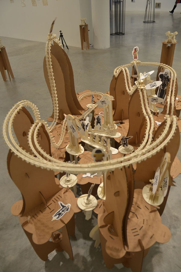 « The book of Mot » is a multi-facetted installation about propaganda inspired by the Khmer Rouge agenda, the construction of mythology and the vanity of the figure of the hero. The catalyst for the project is a play on my family name, which is Mot, which is also the name of the God of death in his realm named HMRY in Canaanites mythology. The figure of the rollercoaster was used as a central figure in order to convey the generic structure of the storytelling of a hero and those victims of the hero's propaganda.