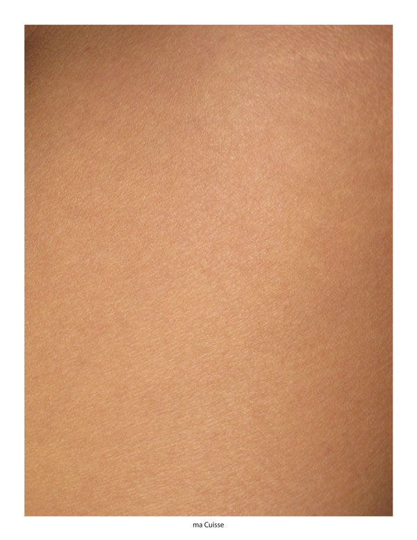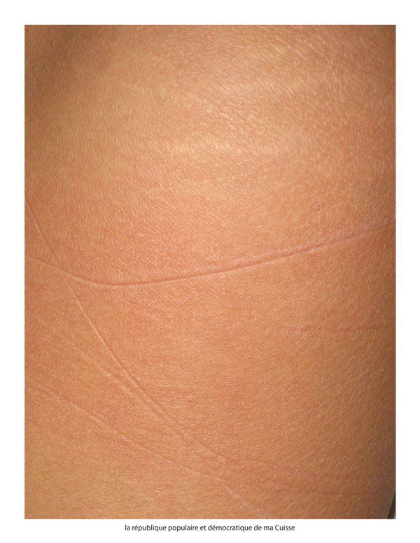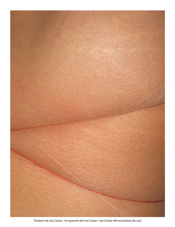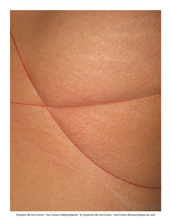 Ma cuisse géopolitique is a satire of the geographic history of a region; a work that denotes the triviality of politic rivalities that shape collective memory. By the actions of tensions of a simple nylon string on the skin I express the division of the Humans through past imaginary borders that affect our consciousness and their sense of belonging through country names.