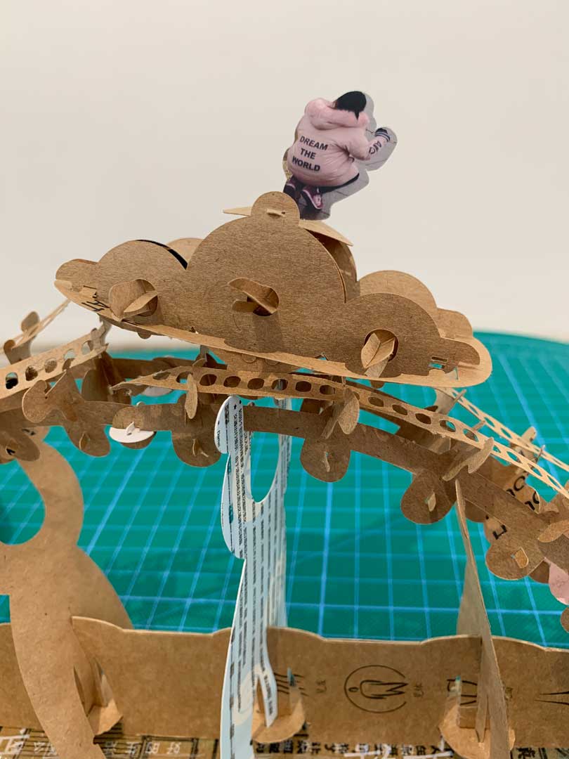 « Dream the World - Chapter 1 » Vita, meaning “life” in Italian, found on a lemon tea juice box, 彷徨洗掉了那些, meaning “Wash off those worries”, found on a discarded shower brush instruction package and Dream the World found on a winter jacket are words that are the basis of this work inspired by the notion of belonging, the US and China trade war and the cultural inquisitiveness in face of Han Chinese idealism. The work uses salvaged packaging elements and warning labels, discarded takeout delivery boxes, popular Chinese TV drama, color sensors, LED lights, and found items within his vicinity which has been worked, included and modified.