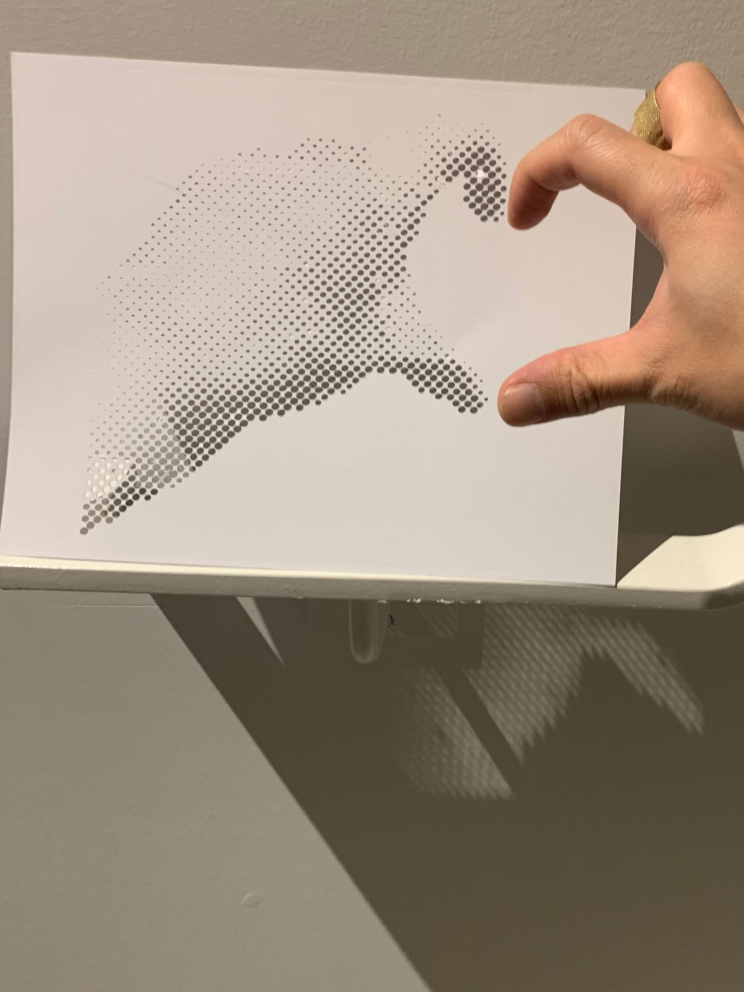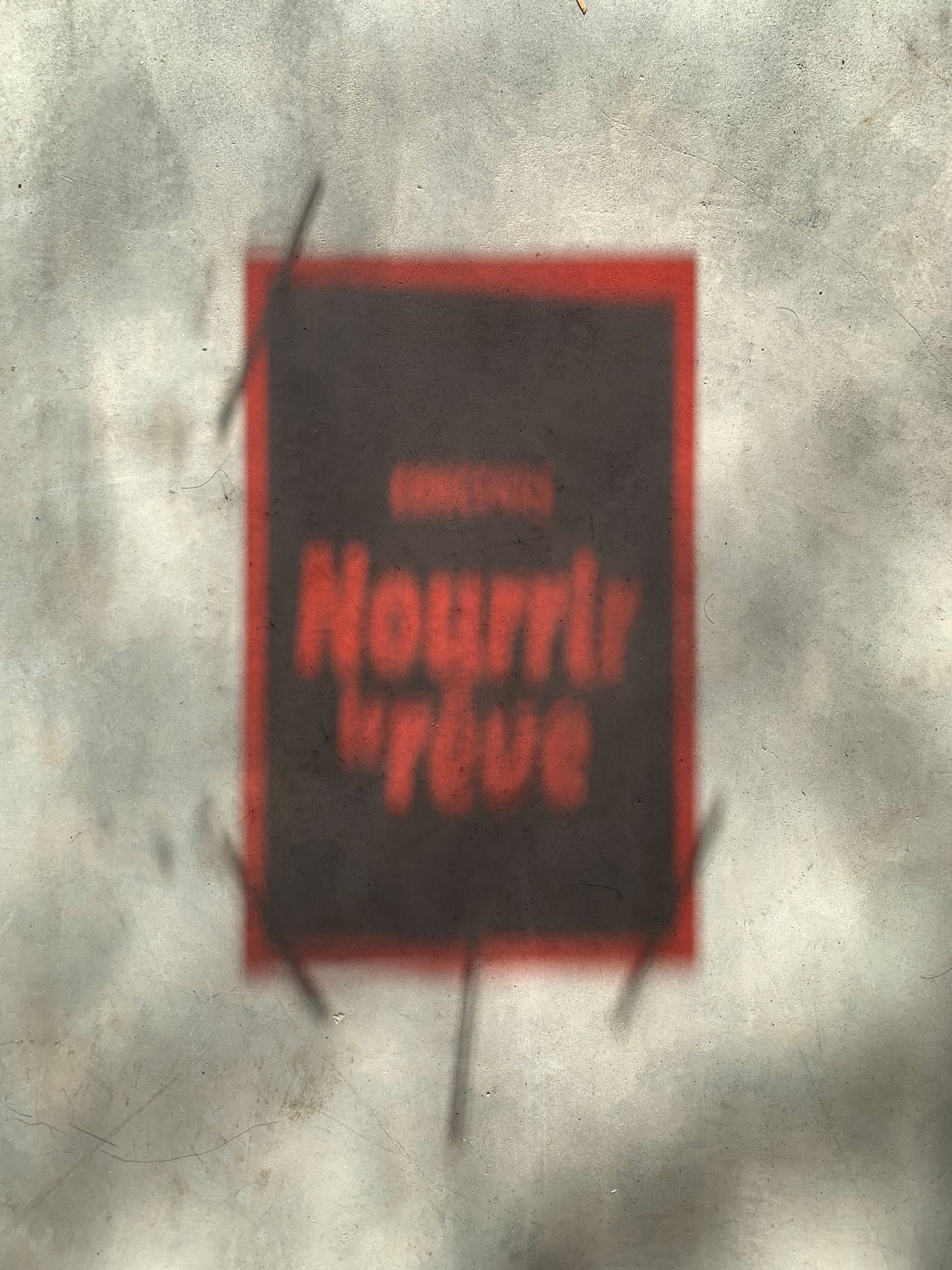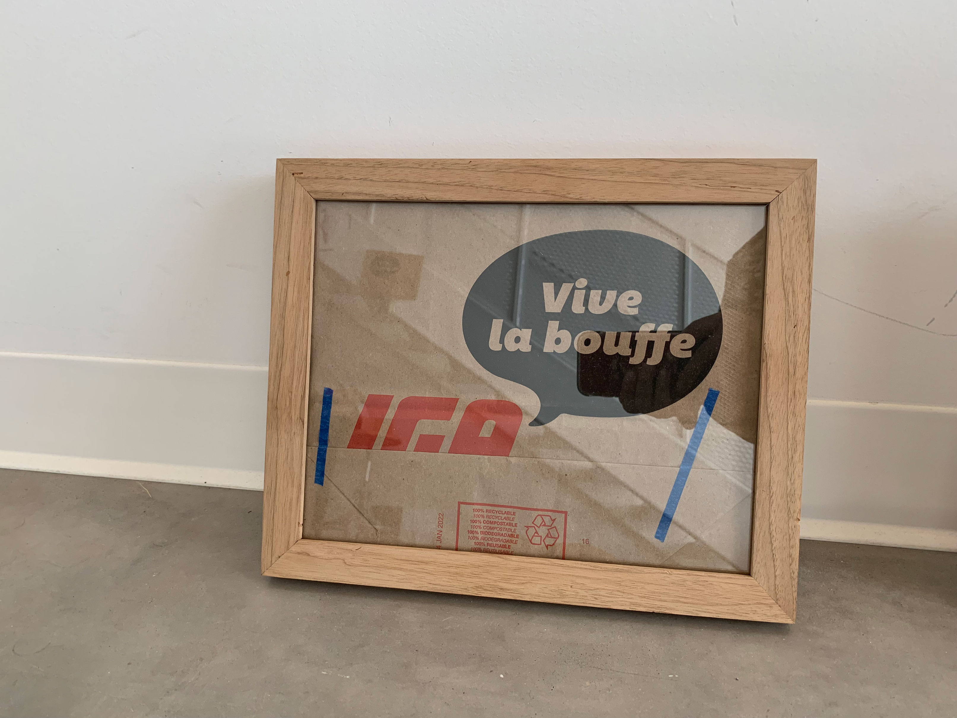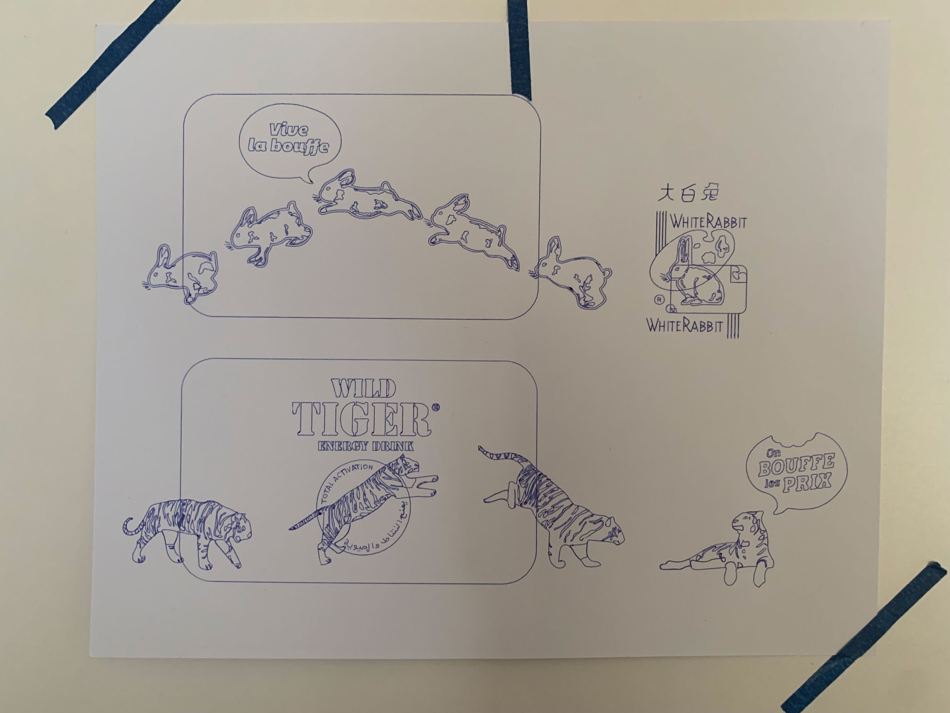 The last series of research is titled: "J'aime la bouffe/On bouffe Les Prix", (2022): Is a series of works based on Edward Said's Orientalism and Spivak's notion of the subaltern by intermingling and opposing symbolism such as an energy drink from Irak "Wild Tiger" and a condensed milk candy "White Rabbit" as a way to explore immigration and borders relations by engaging with particular semantic of alienation through a kinetic paper sculpture presenting moving drawing like animated GIFs and prints found on grocery bags of the local IGA.