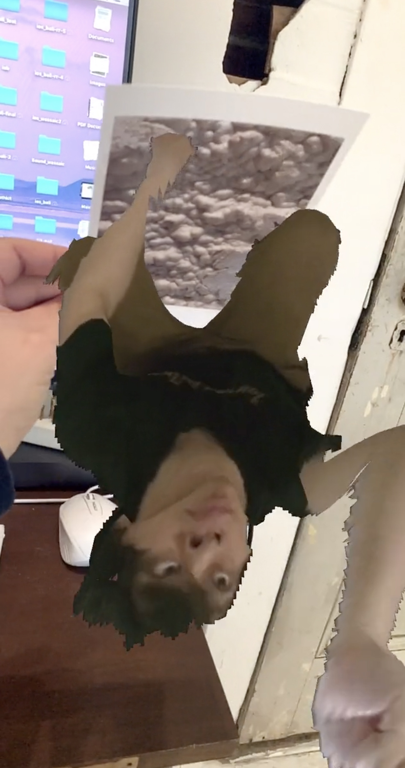 « I love hummus » is an (AR) Augmented Reality app made using the ceiling of my studio, 2.5 Dimensions photogrammetric capture and blue corn tortillas. The elements are meant to signifie a sense of intimacy as I reduce the size of my room to a sugarcube by aggregation of volumetric capture while living an uncongruous relationship with the physicality of my surroundings.