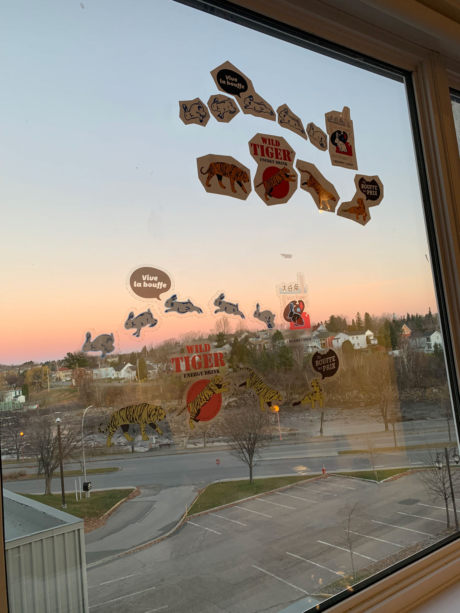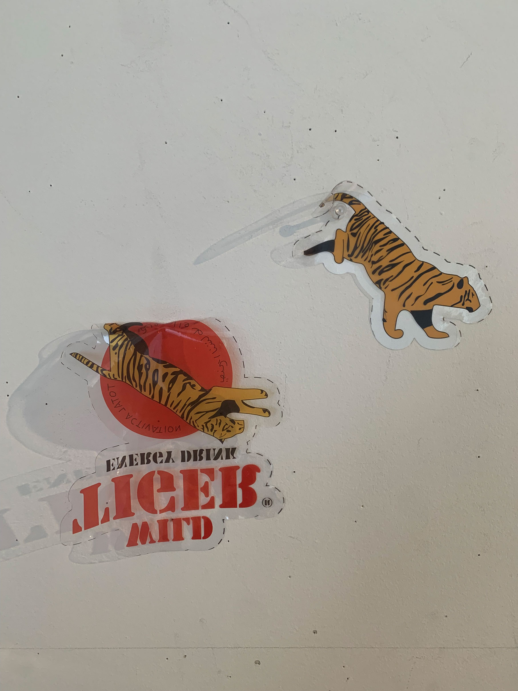 Latex print on adhesive vinyl, 12 in x 12 in; the work is a mise-en-scene between prey and predator such as "Wild Tiger" (an energy drink brand from Irak) and "White Rabbit" (a candy brand from Taiwan) through an animated study. The work address this normalization of inequity and disparity while promoting alienation point of view in racialize context through semantic slides.