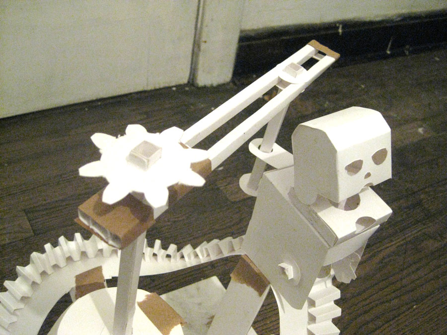 Inspired by the elections in Mexico, My goal was to design a kinetic architecture that could be used in street performance and pushed by as many people as needed. Constructed on wheels , operated by two performer and made of rusted metal; the gigantic being will roll through the circular rollercoaster track while violently opening and closing its mouth in order to amplify the sound of the protest with its metallic jaws.