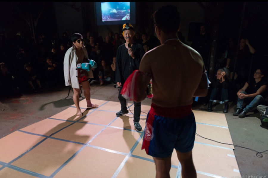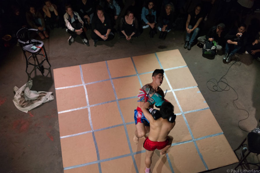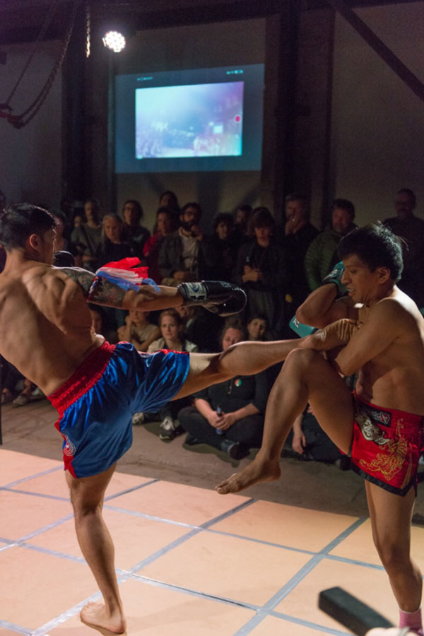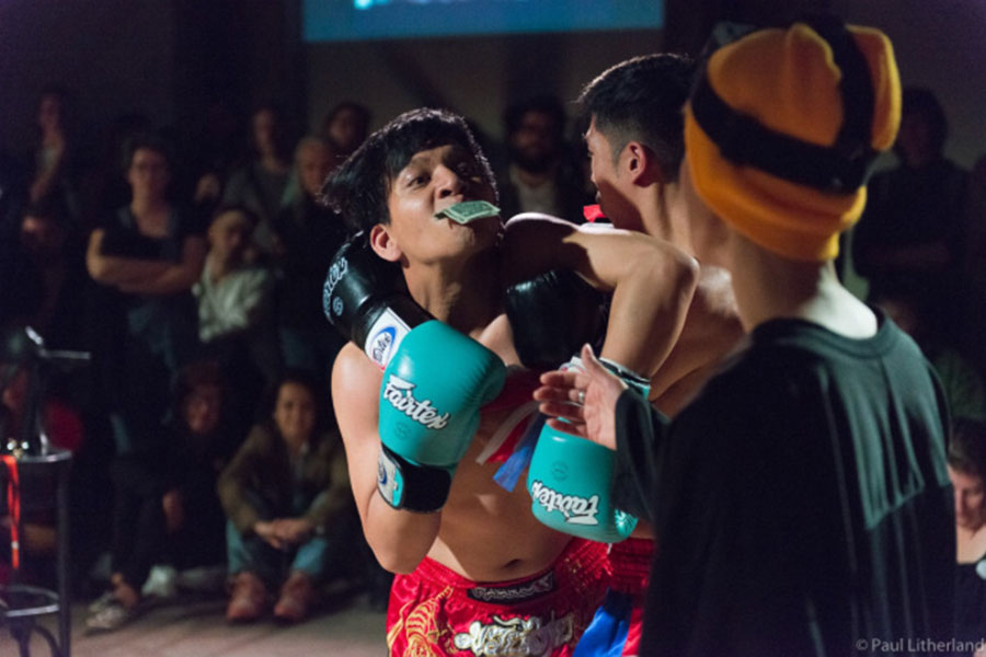 In the first act titled: « Train Easy, Fight Sleazy; Muay Thai », I explore the rules of engagement as a petty gangster. The character doesn’t believe in the old warrior way where promises of glory awaits those who “train hard” in order to “fight easy”. Un-subservient to morality, ethic and sportsmanship; he believe that only fools oppressed by the system will believe in those instituted fairy tales related to hard work and retirement plans. An entitled hedonistic being at the core; JP Mot “train easy” and “fight sleazy”.- Great thanks to Kelvin Tran and Kimura Boyle for their generous participation; photo credit: Paul Litherland