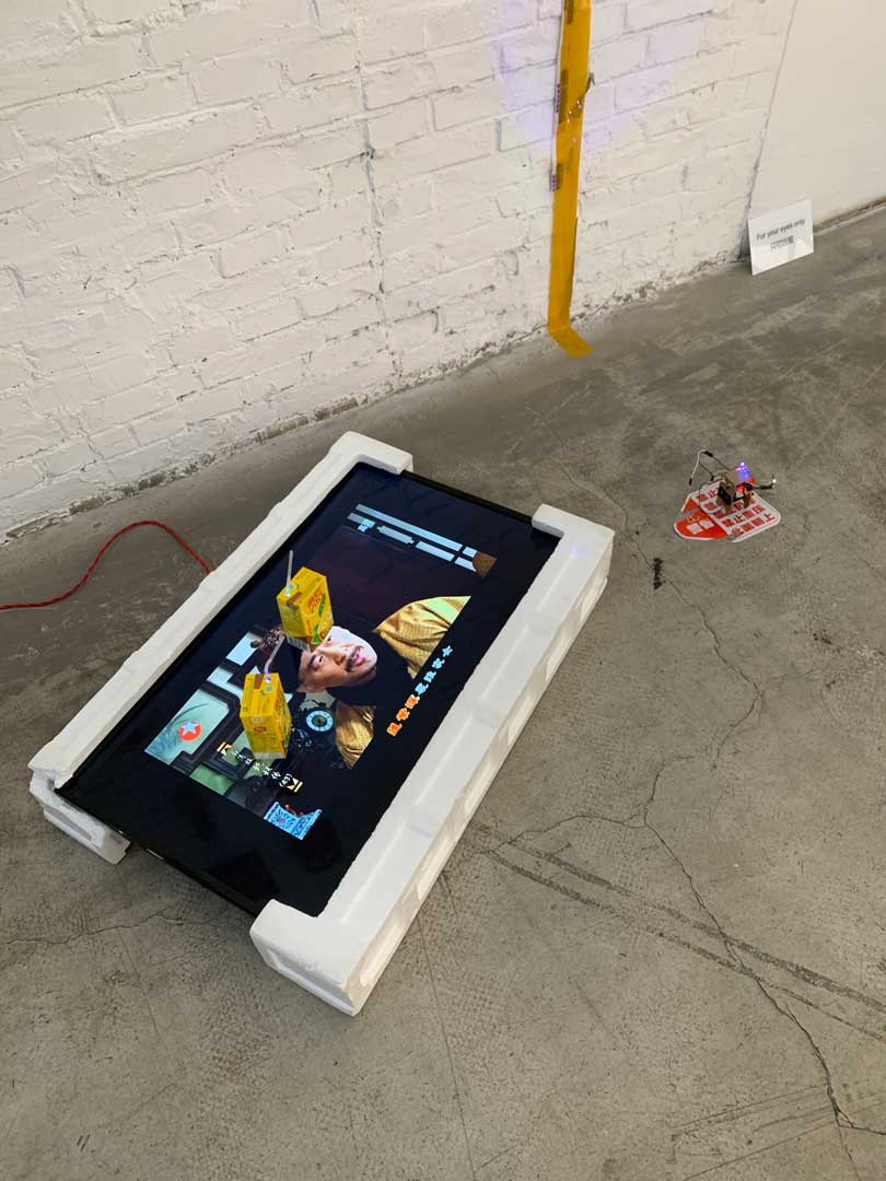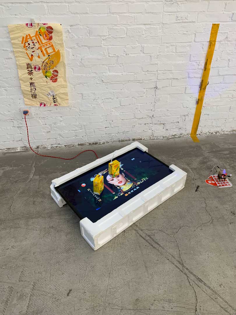 « Dream the World - Chapter 2 » Vita, meaning “life” in Italian, found on a lemon tea juice box, 彷徨洗掉了那些, meaning “Wash off those worries”, found on a discarded shower brush instruction package and Dream the World found on a winter jacket are words that are the basis of this work inspired by the notion of belonging, the US and China trade war and the cultural inquisitiveness in face of Han Chinese idealism. The work uses salvaged packaging elements and warning labels, discarded takeout delivery boxes, popular Chinese TV drama, color sensors, LED lights, and found items within his vicinity which has been worked, included and modified.